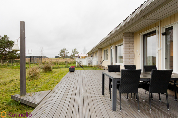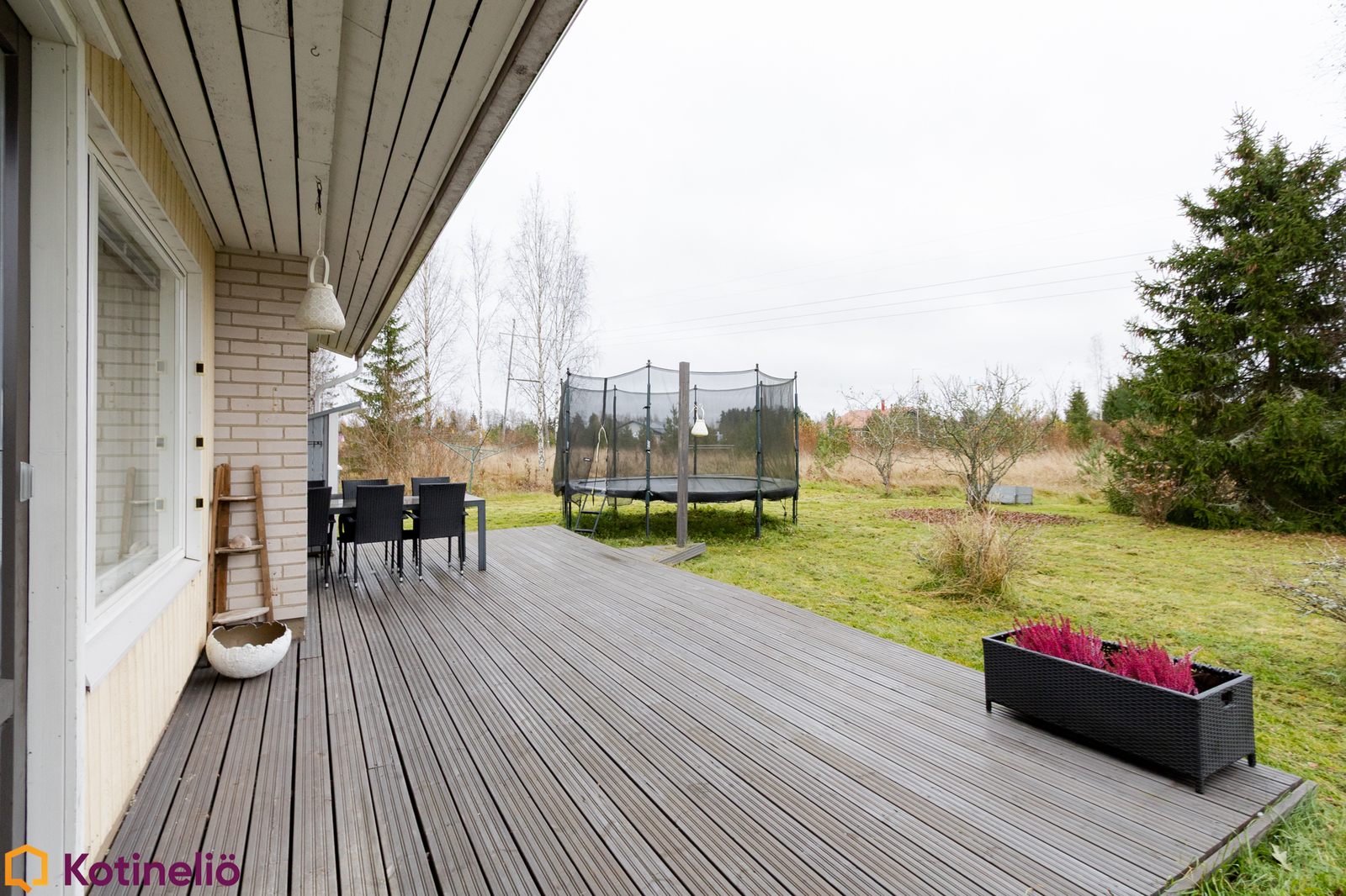 Lähes koko asunnon levyinen tilava terassi avautuu vehreälle pihalle, jossa kasvaa omanapuita ja marjapensaita.