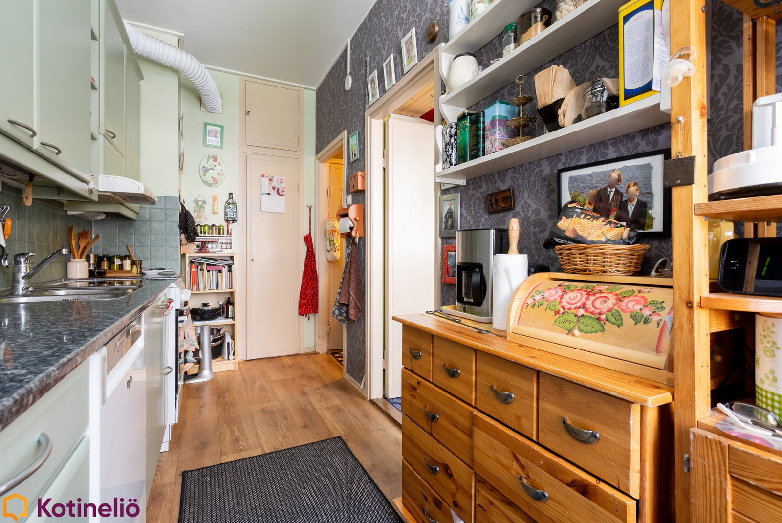 Muiden tilojen kuvaus | Tilava eteinen jossa naulakko ja kaapisto, apukeittiö. Huoneistoon on alkuperäisenä 2 sisääntuloa, toinen on pois käytöstä, voi palauttaa. |