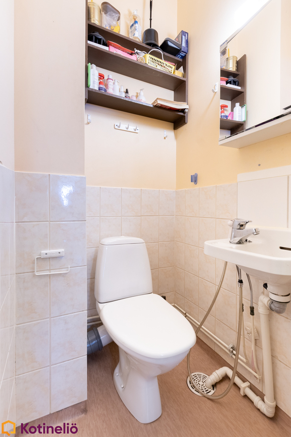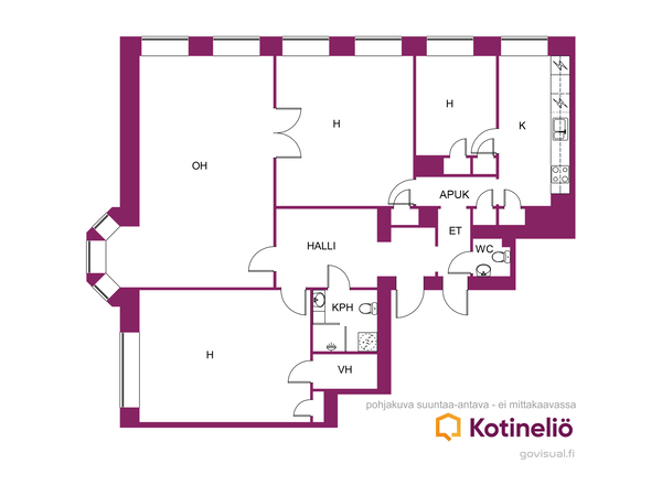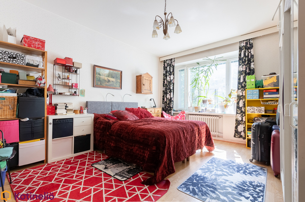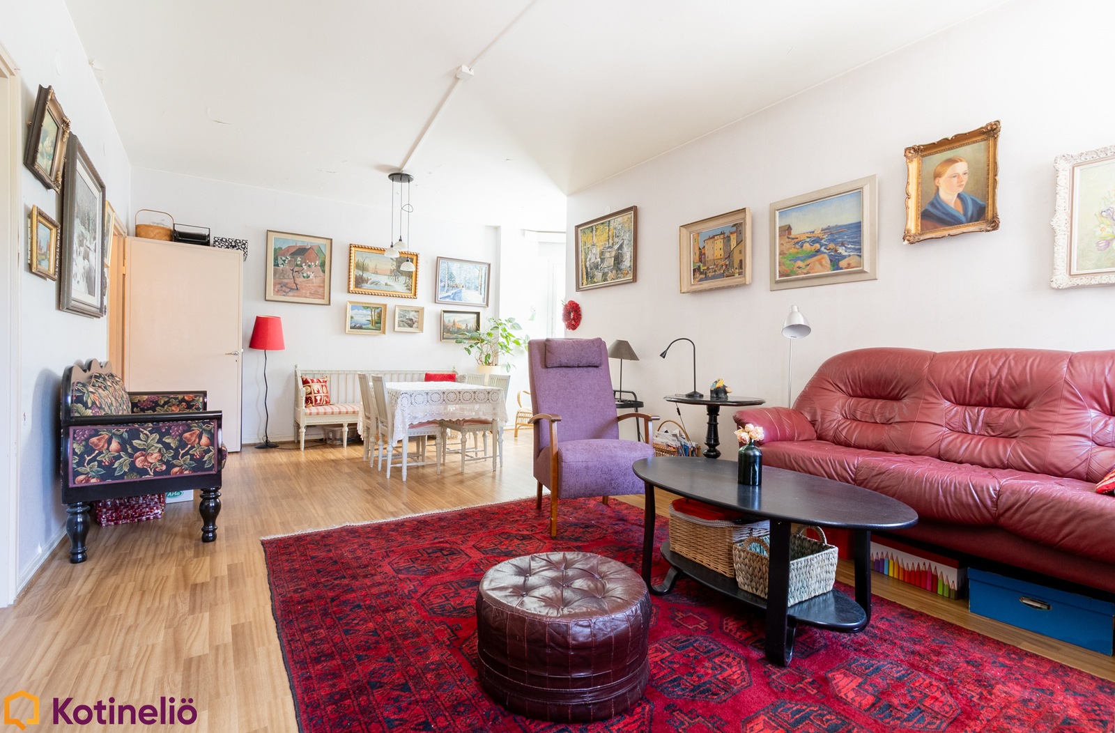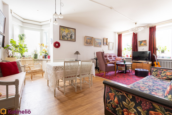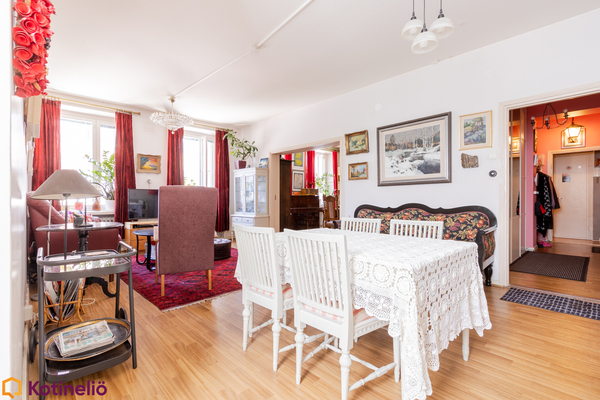 Asunnossa on toimiva ja muunneltava pohjaratkaisu. Iso olohuone ja tilava ruokailutila, kaksi makuuhuonetta, keittiö apukeittiöllä sekä erillinen wc ja kylpyhuone/wc. Lisäksi asuntoon kuuluu toinen sisäänkäynti. Pitkään nykyisen omistajan toimesta asuttu huoneisto kaipaa pinnoiltaan laittoa, remontilla siitä saa todellisen edustusasunnon vuosiksi eteenpäin.