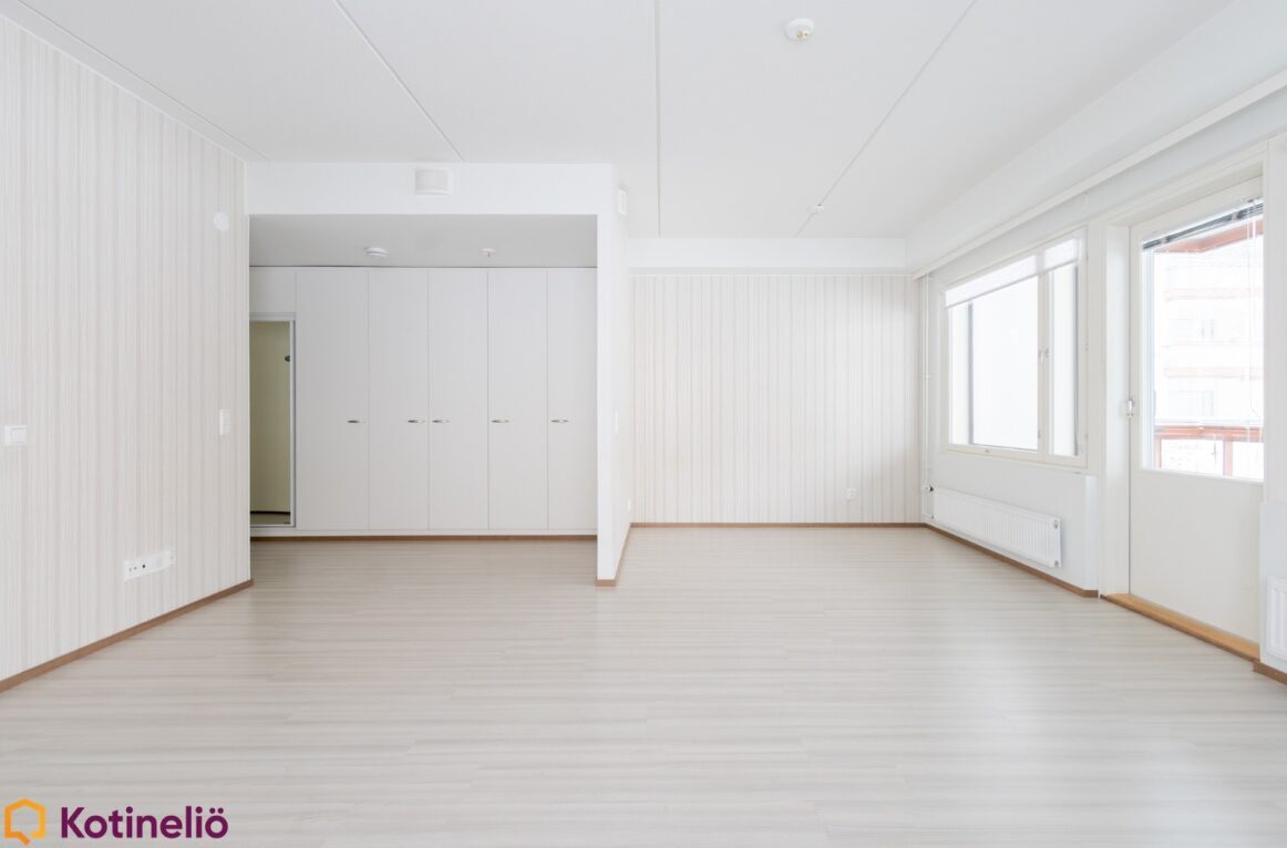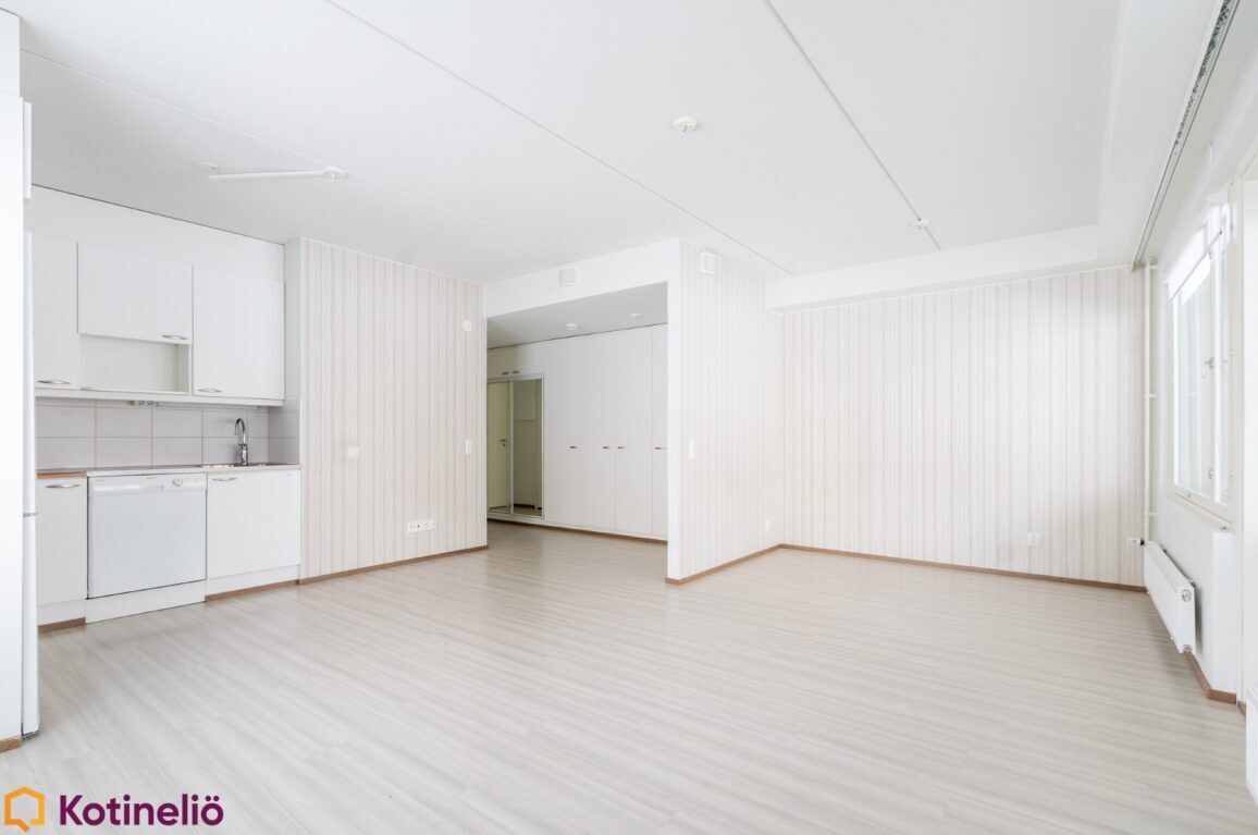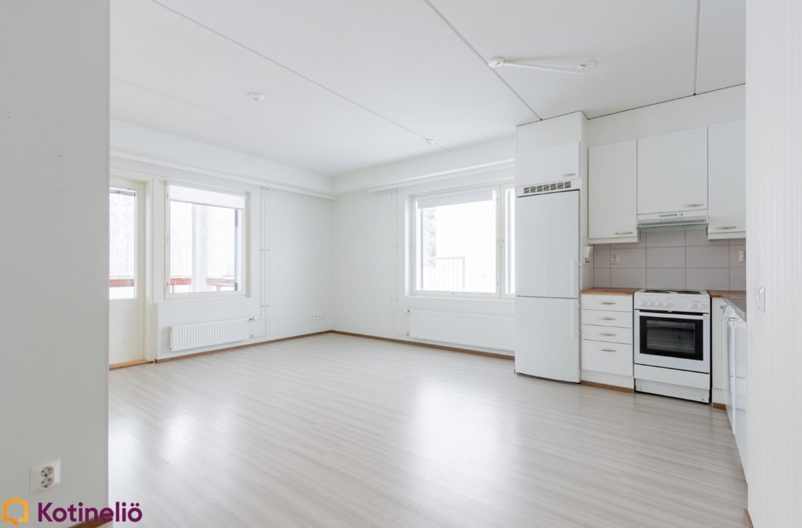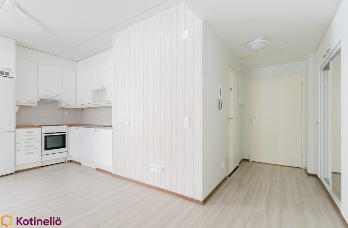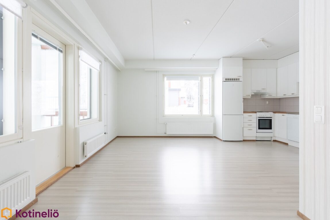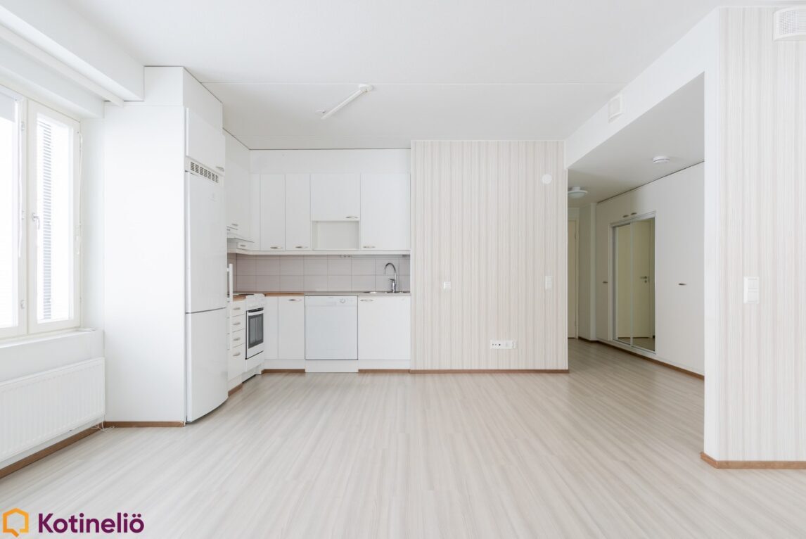 | Keittiön kuvaus | Koko asuinhuoneiston lattiat on märkätiloja lukuun ottamatta vaaleaa laminaattia. |