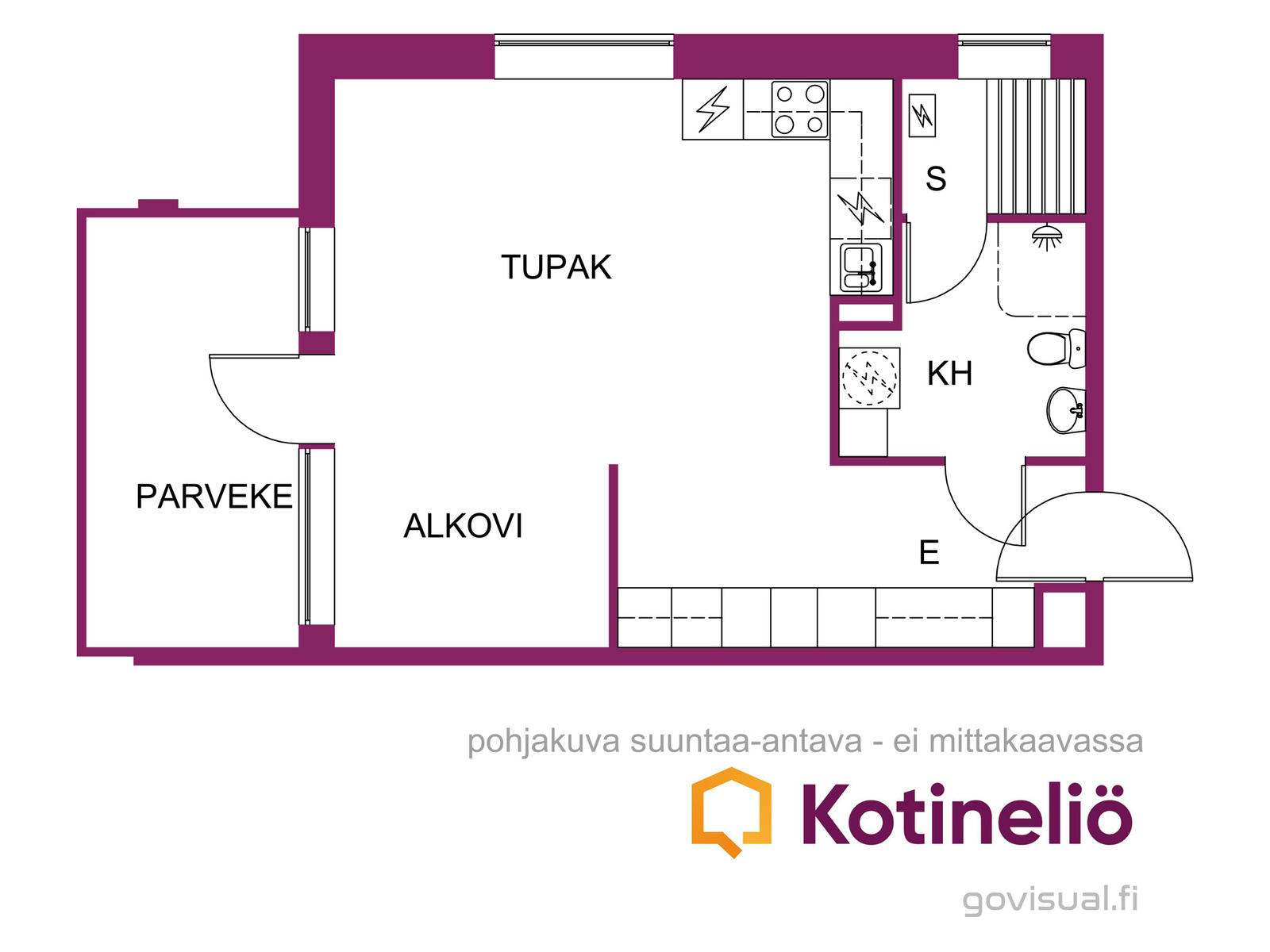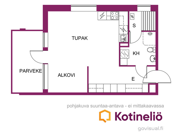 Tupakeittiö+alkovi, sauna/kph, lasit.parv.Asuinpinta-ala
