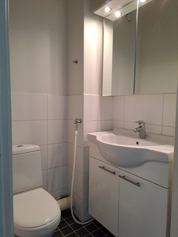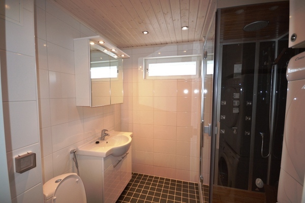 | Kylpyhuoneen kuvaus | Seinät ja lattia laatoitettu, lattialämmitys. Allas- ja peilikaappi. Suihkukaappi. Ikkuna. |
