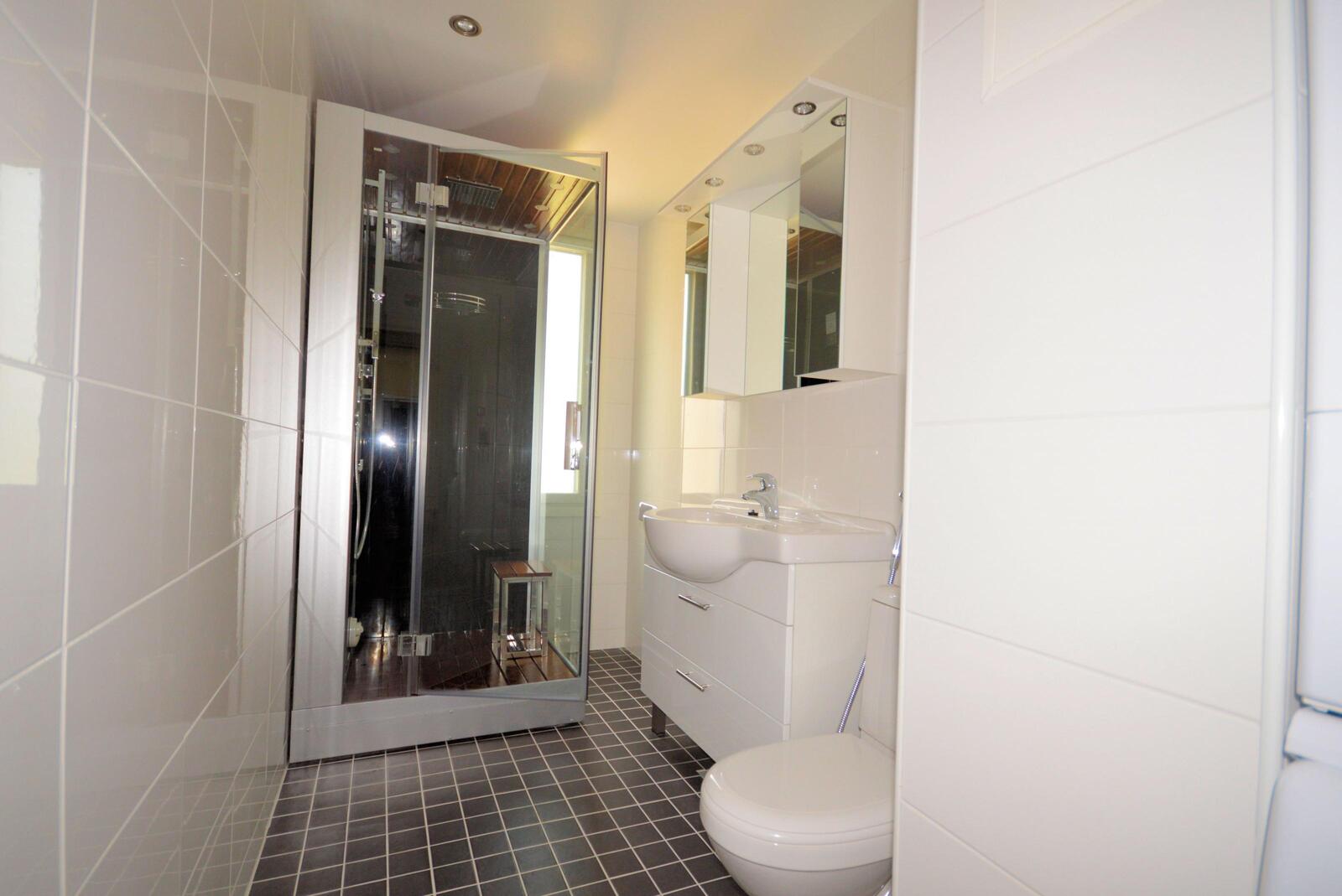 | Kylpyhuoneen kuvaus | Laatoitettu, lattialämmitys, allas- ja peilikaapisto, höyrykylpykaappi. |