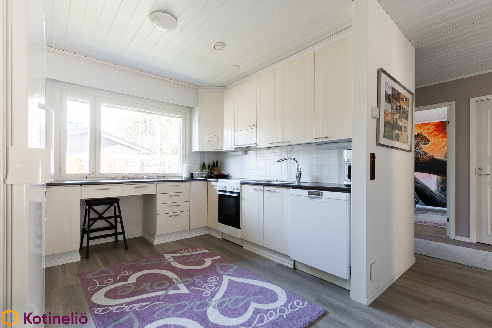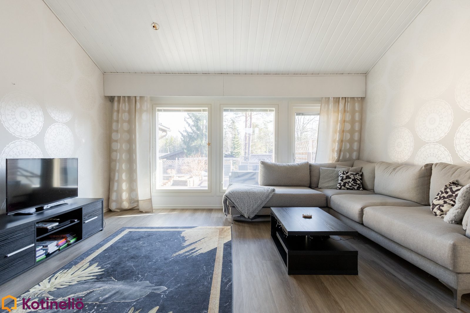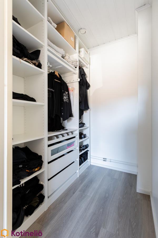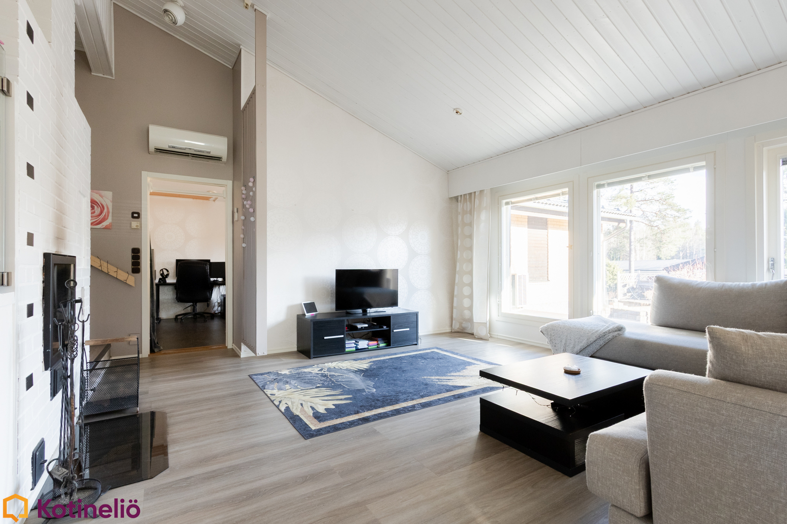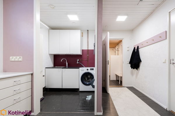 Kodissa hurmaa erityisesti korkea ja avara olohuone, jossa näyttävä takka toimii tilanjakajana luoden tunnelmaa ja lämpöä. Olohuone yhdistyy luontevasti keittiöön, muodostaen toimivan kokonaisuuden arkeen ja yhdessäoloon. Tilaa riittää isommallekin perheelle, sisältäen mm. 3 makuuhuonetta, työhuoneen, 2 kodinhoitotilaa ja runsaasti säilytysratkaisuja.