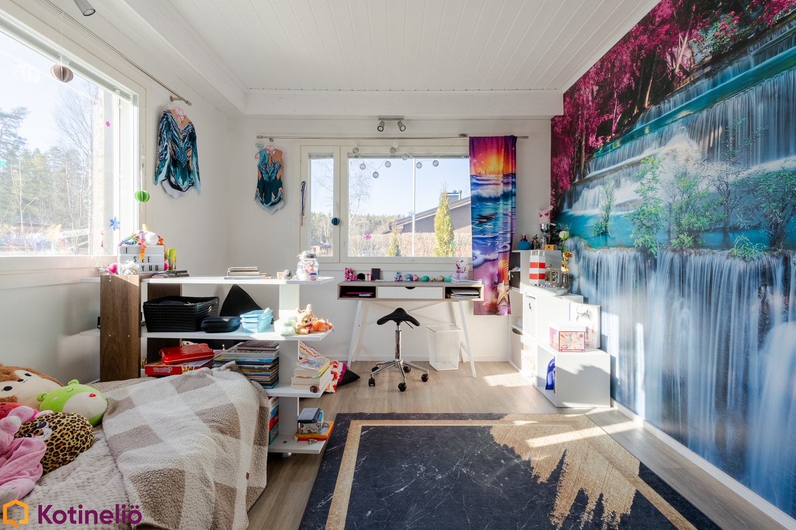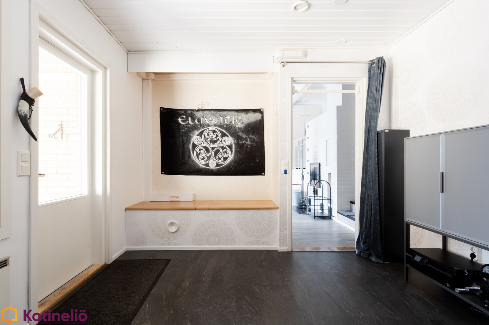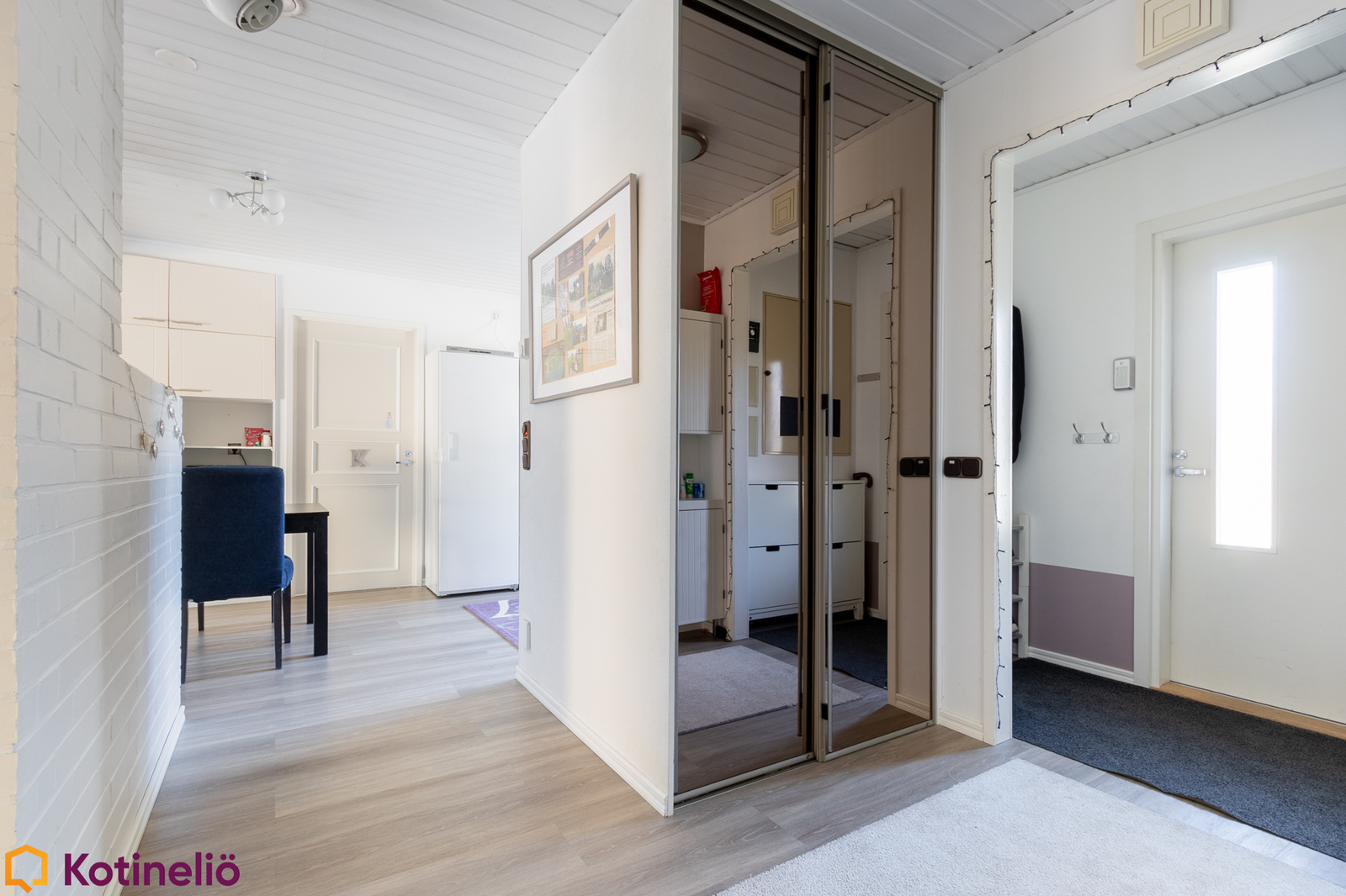 Kodissa hurmaa erityisesti korkea ja avara olohuone, jossa näyttävä takka toimii tilanjakajana luoden tunnelmaa ja lämpöä. Olohuone yhdistyy luontevasti keittiöön, muodostaen toimivan kokonaisuuden arkeen ja yhdessäoloon. Tilaa riittää isommallekin perheelle, sisältäen mm. 3 makuuhuonetta, työhuoneen, 2 kodinhoitotilaa ja runsaasti säilytysratkaisuja.