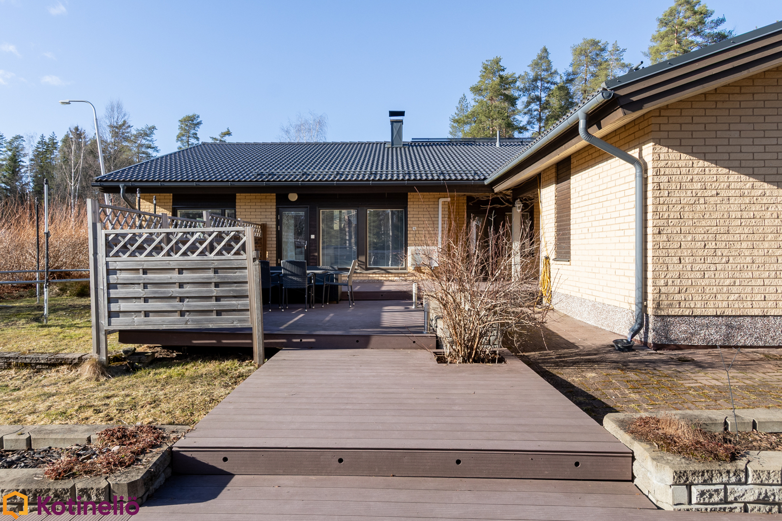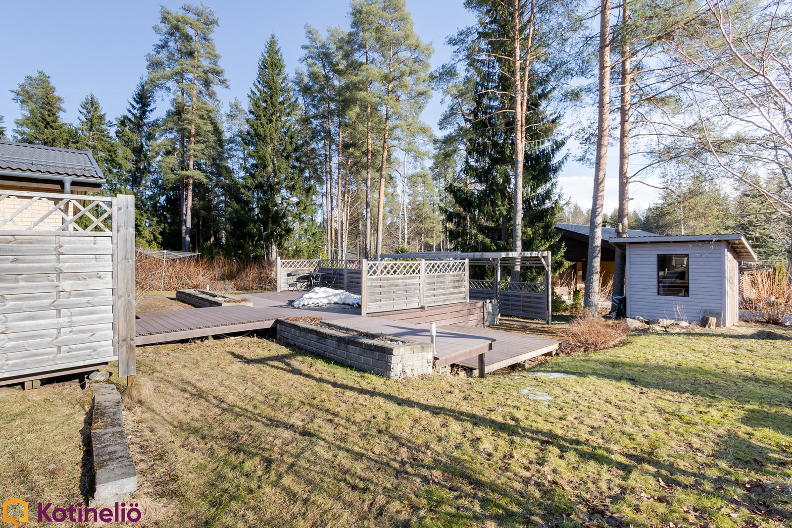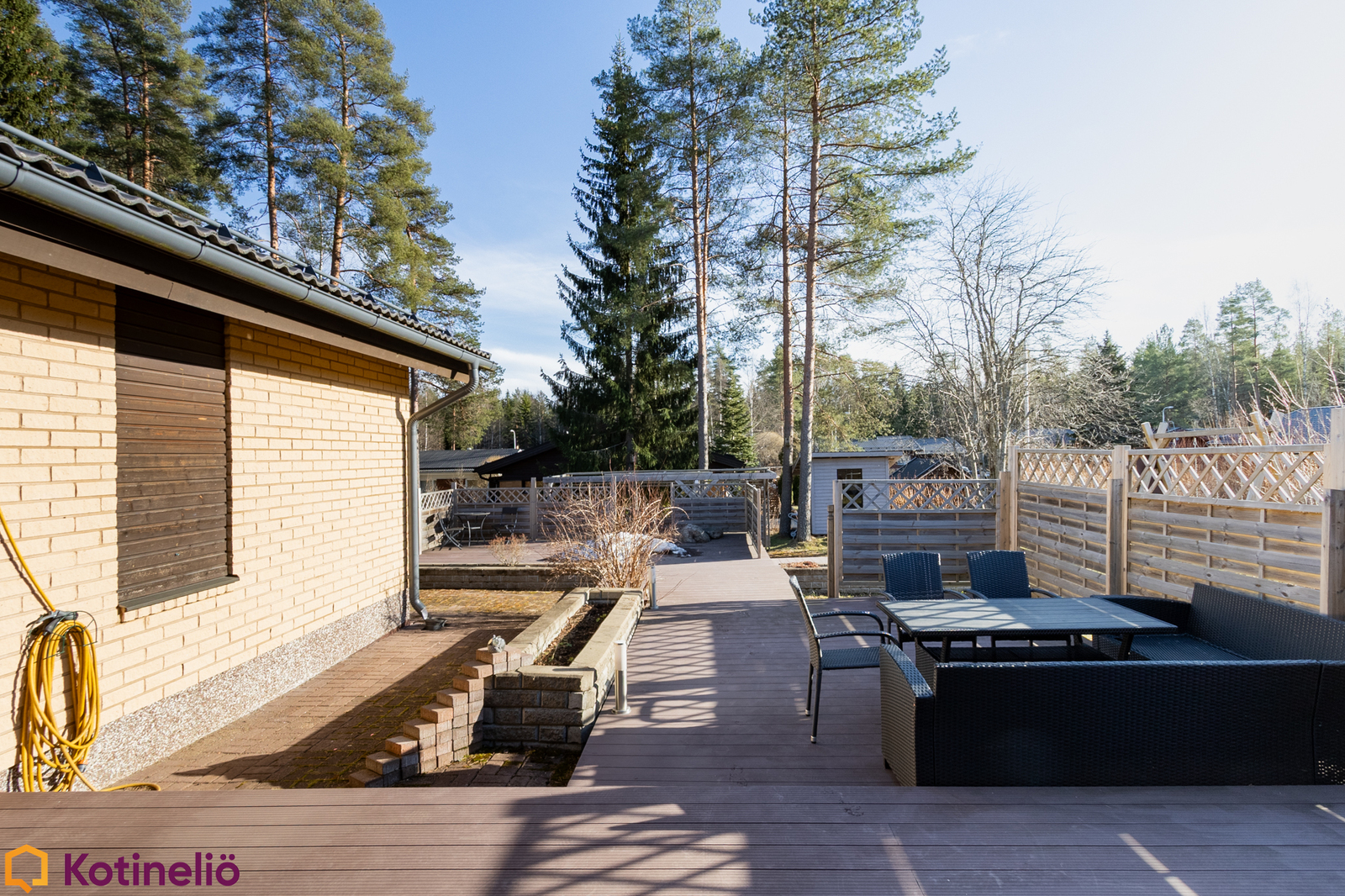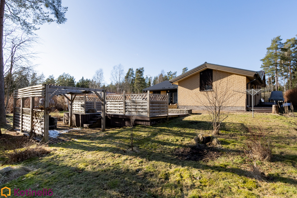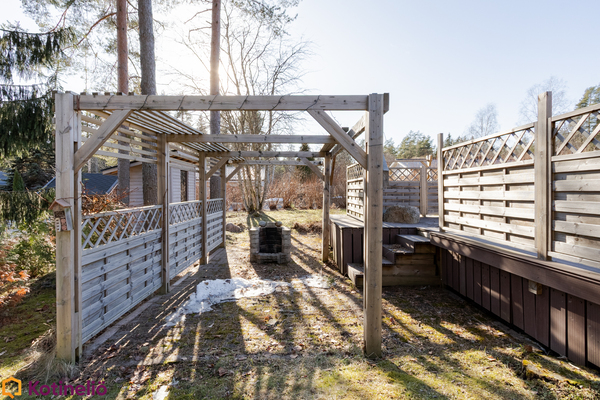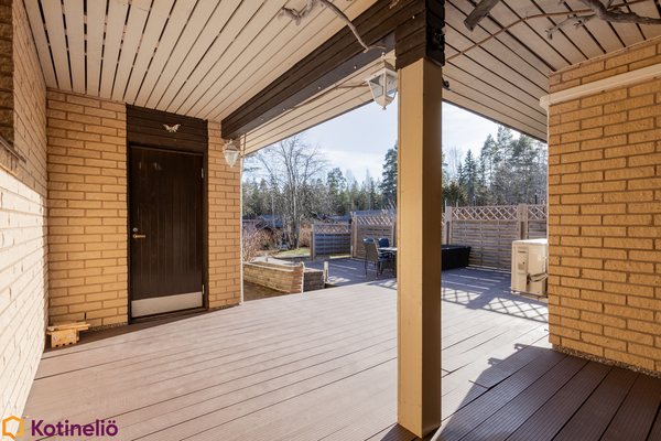Pihapiiri on monipuolinen ja viihtyisä. Monipuoliset terassit on tehty komposiitista, tilaa riittää sekä lasten leikeille että aikuisten grillaukseen ja chillailuun. Erilliset varastot ja autotalli tuovat lisää vaihtoehtoja monenlaiseen tarpeeseen. Alueella on erinomaiset ulkoilumahdollisuudet, ja läheltä löytyvät niin lenkkipolut, uimaranta kuin lasten koulutkin.
