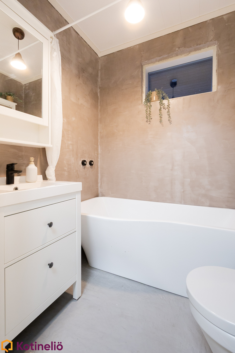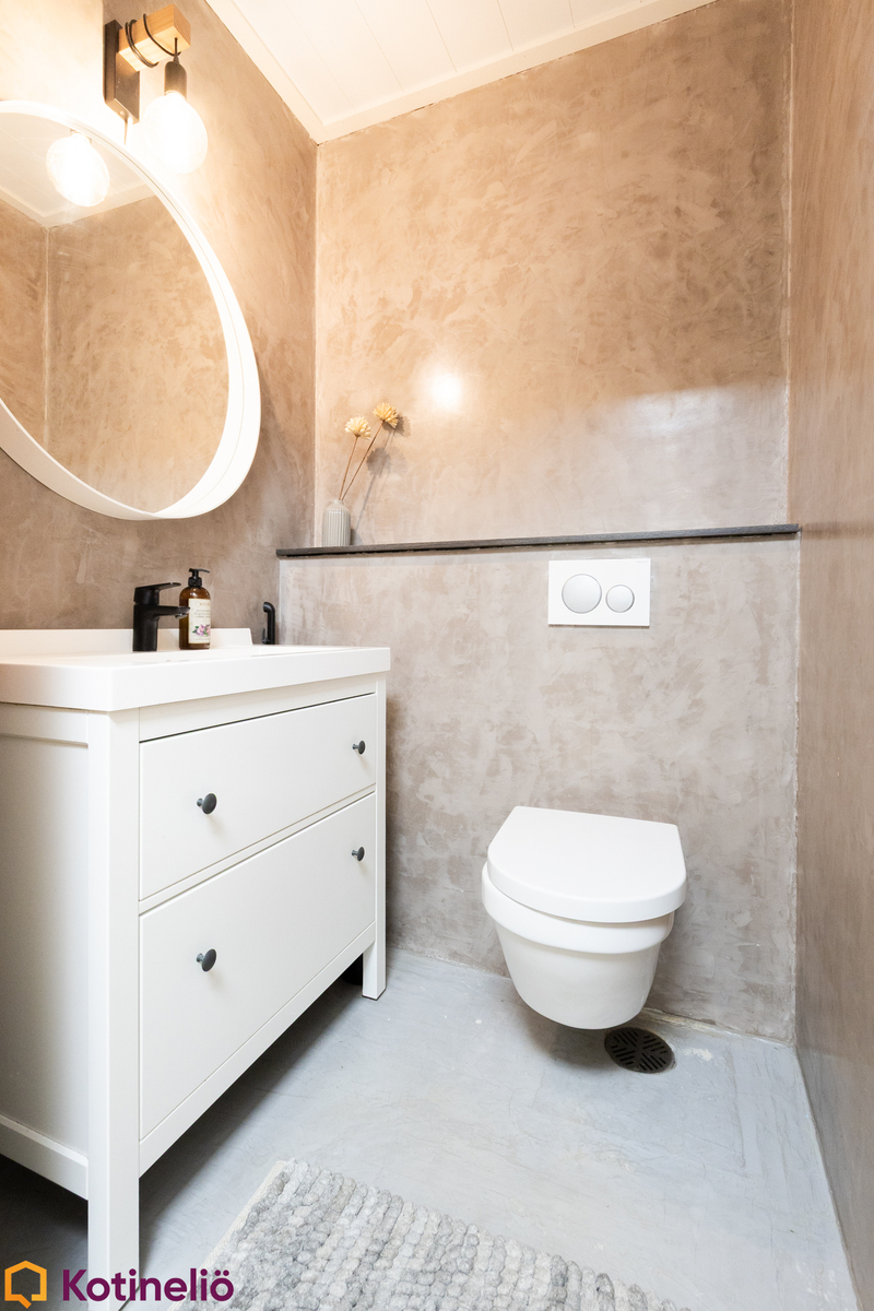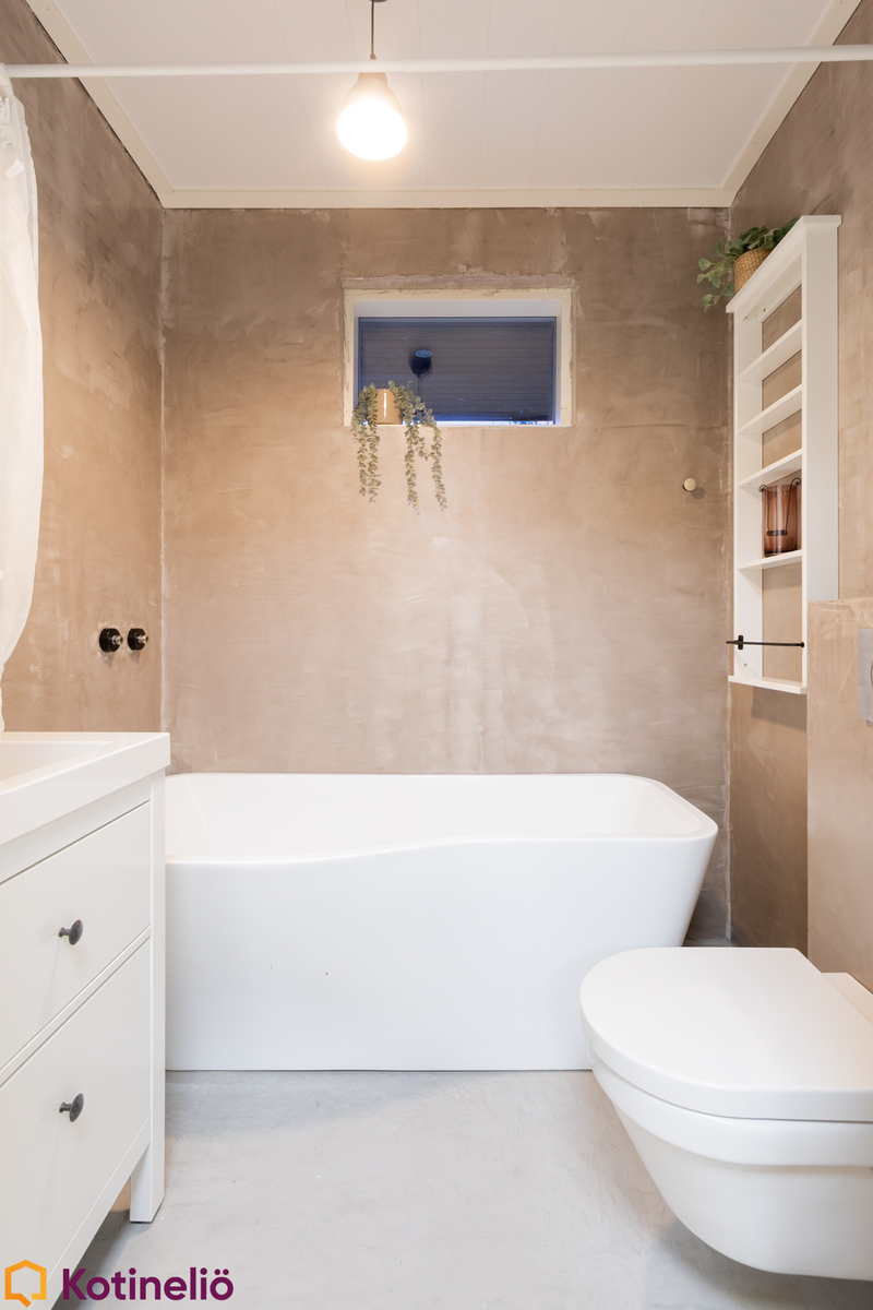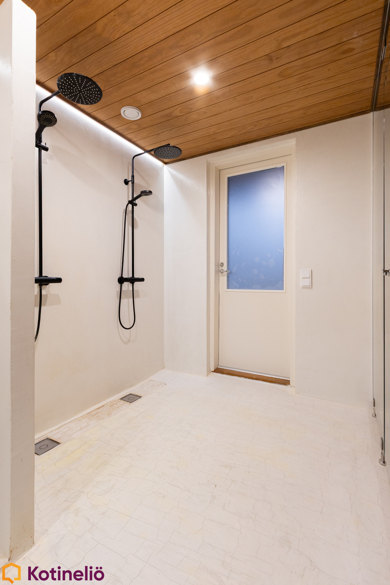 | Kylpyhuoneen kuvaus | Saunan yhteydessä olevan kylpyhuoneen seinät ja lattia mikrosementtiä, katto paneelia. 2 suihkua. Toisessa kylpyhuoneessa on kylpyamme, wc-pönttö sekä käsienpesuallas. |
