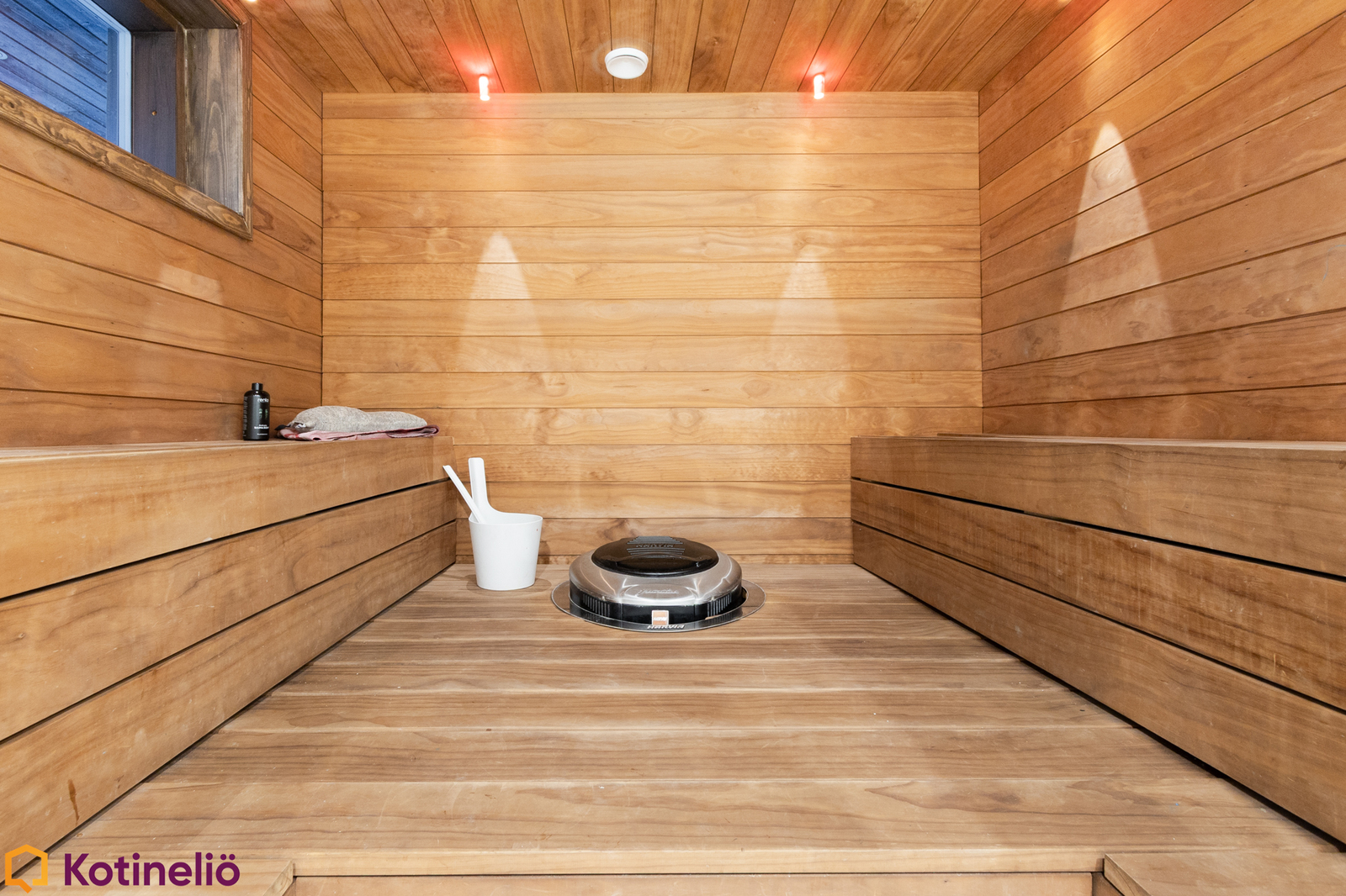 | Saunan kuvaus | Sauna sijaitsee isomman kylpyhuoneen yhteydessä, lasiseinä lasiovella. Lauteet, seinät ja katto puuta. Lattia mikrosementtiä. |