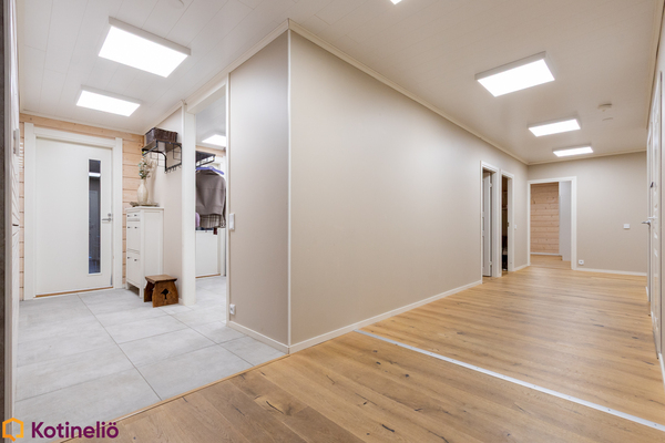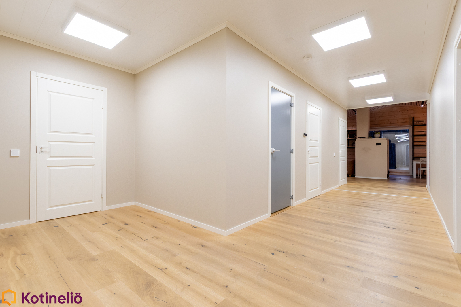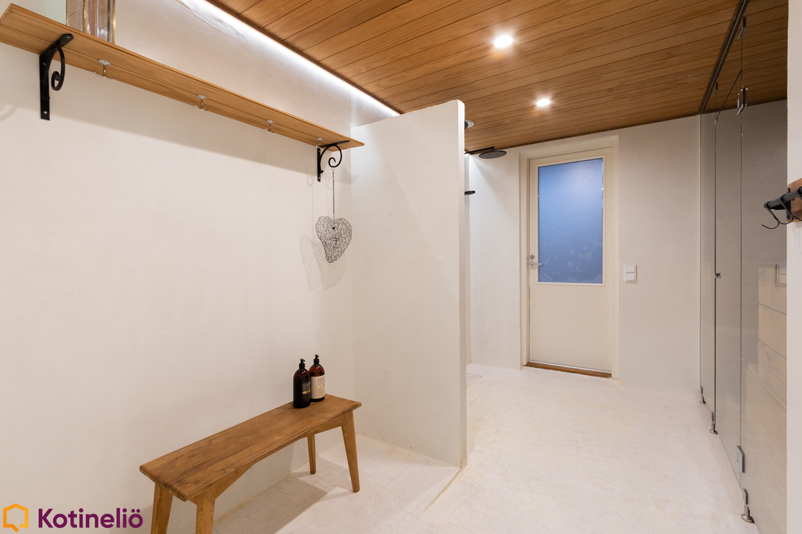 | Muiden tilojen kuvaus | Saunan yhteydessä on tilava pukuhuone. Talossa on eteinen sekä arkieteinen. Asunnon kaikissa tiloissa on vesikiertoinen lattialämmitys. |
